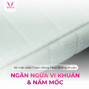 Mặt trên của nệm được chần một lớp foam bông fiber kháng khuẩn, không chỉ tăng cường sự êm ái mà còn giúp nệm luôn sạch sẽ và an toàn cho sức khỏe. Lớp foam này giúp ngăn ngừa vi khuẩn và nấm mốc, bảo vệ bạn và gia đình khỏi các tác nhân gây hại.